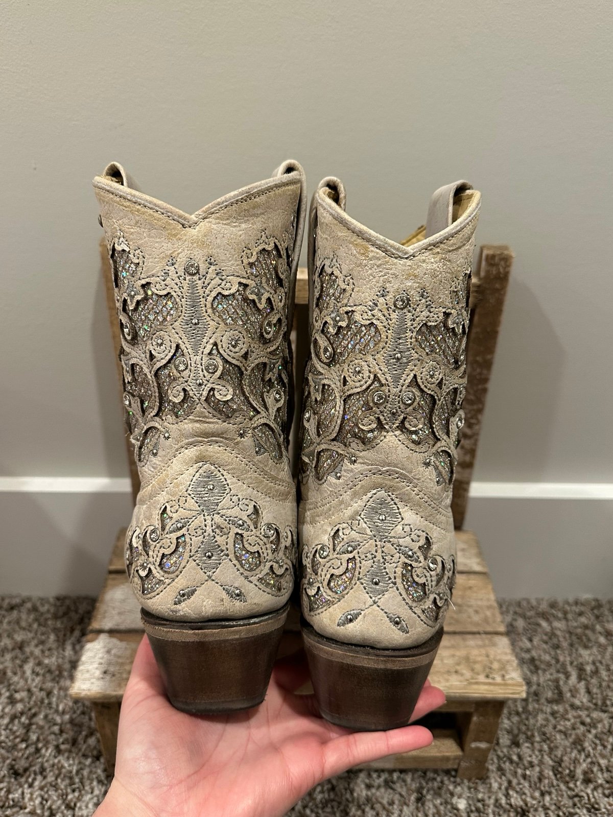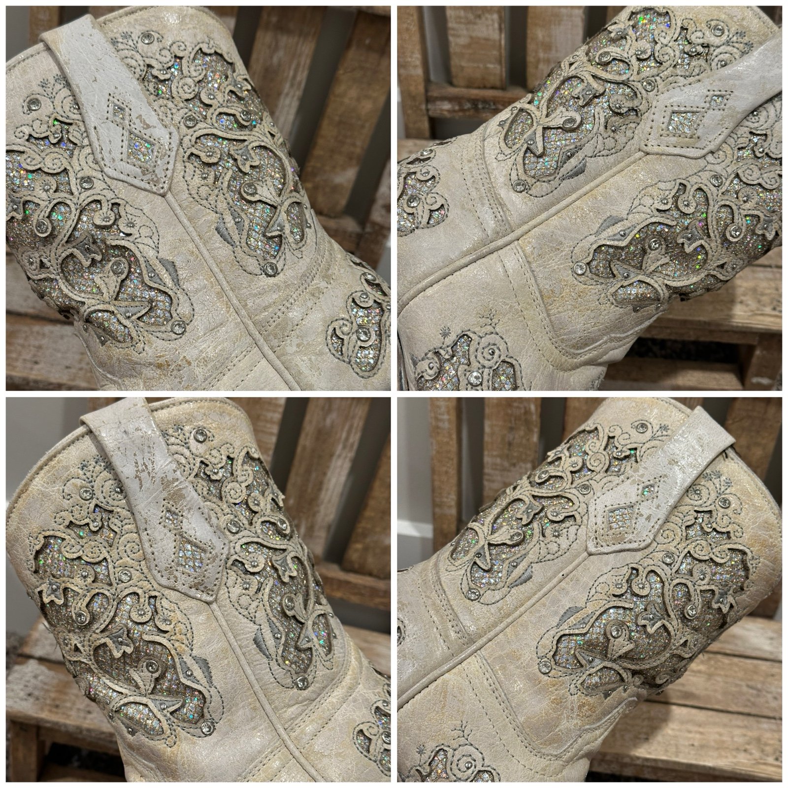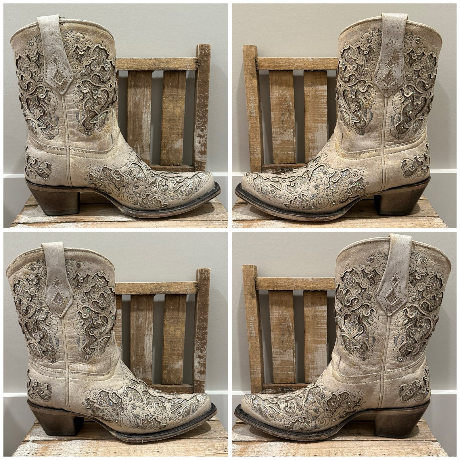 Corral White Glittered Inlay W/ Crystals Snip Toe Short Cowgirl Western Boots Booties Shoes! US Women's size 8! 100% authentic! From a smoke-free home!