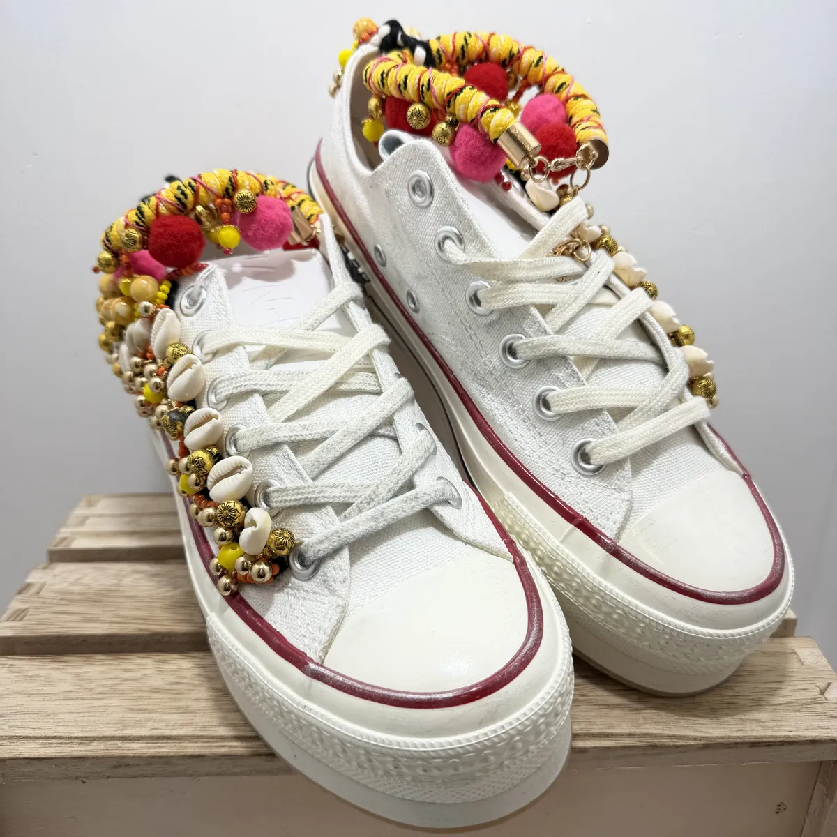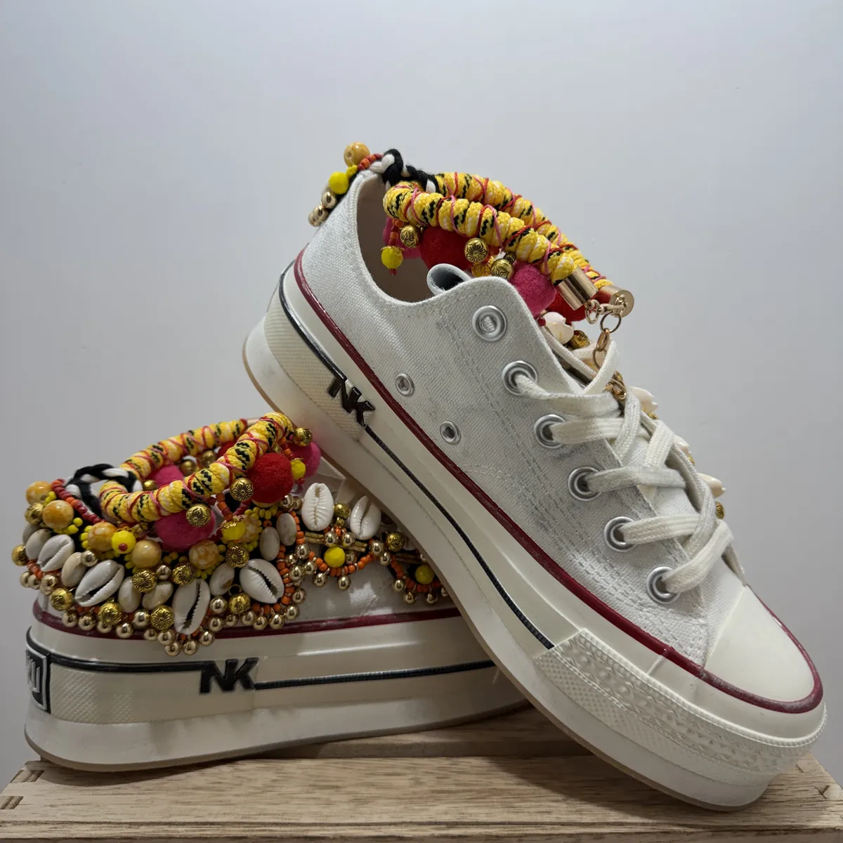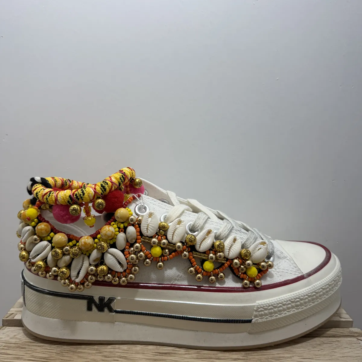 Ces baskets NANKU se distinguent par leur design moderne et leur couleur facile à assortir. La semelle compensée de 5cm garantit un maintien confortable tout en ajoutant de la hauteur. Les points forts de ce modèle sont les détails sur le côté :coquillage, perles…, qui capte la lumière et apporte une note originale. Le bracelet de cheville, et les finitions soignées assurent durabilité et style. Idéales pour un look urbain chic.