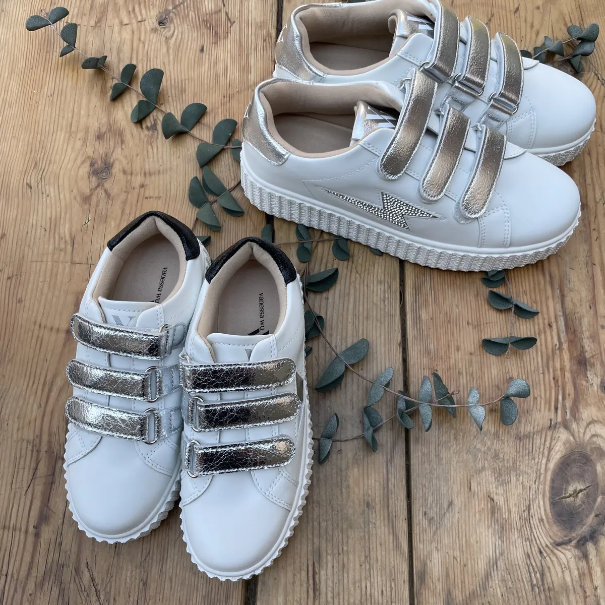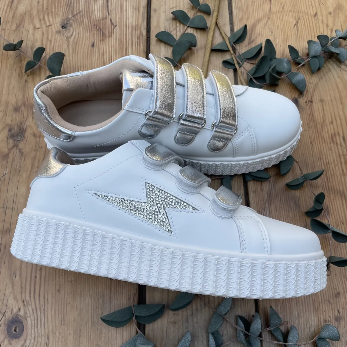 Ajoutez une touche d’éclat à vos looks avec ces baskets en similicuir blanc, sublimées par un éclair argenté serti de strass. Leur design unique et tendance est renforcé par des scratchs argentés, qui apportent brillance et modernité. Leur semelle souple garantit un confort optimal au quotidient tout en mettant une allure féminine et originale.