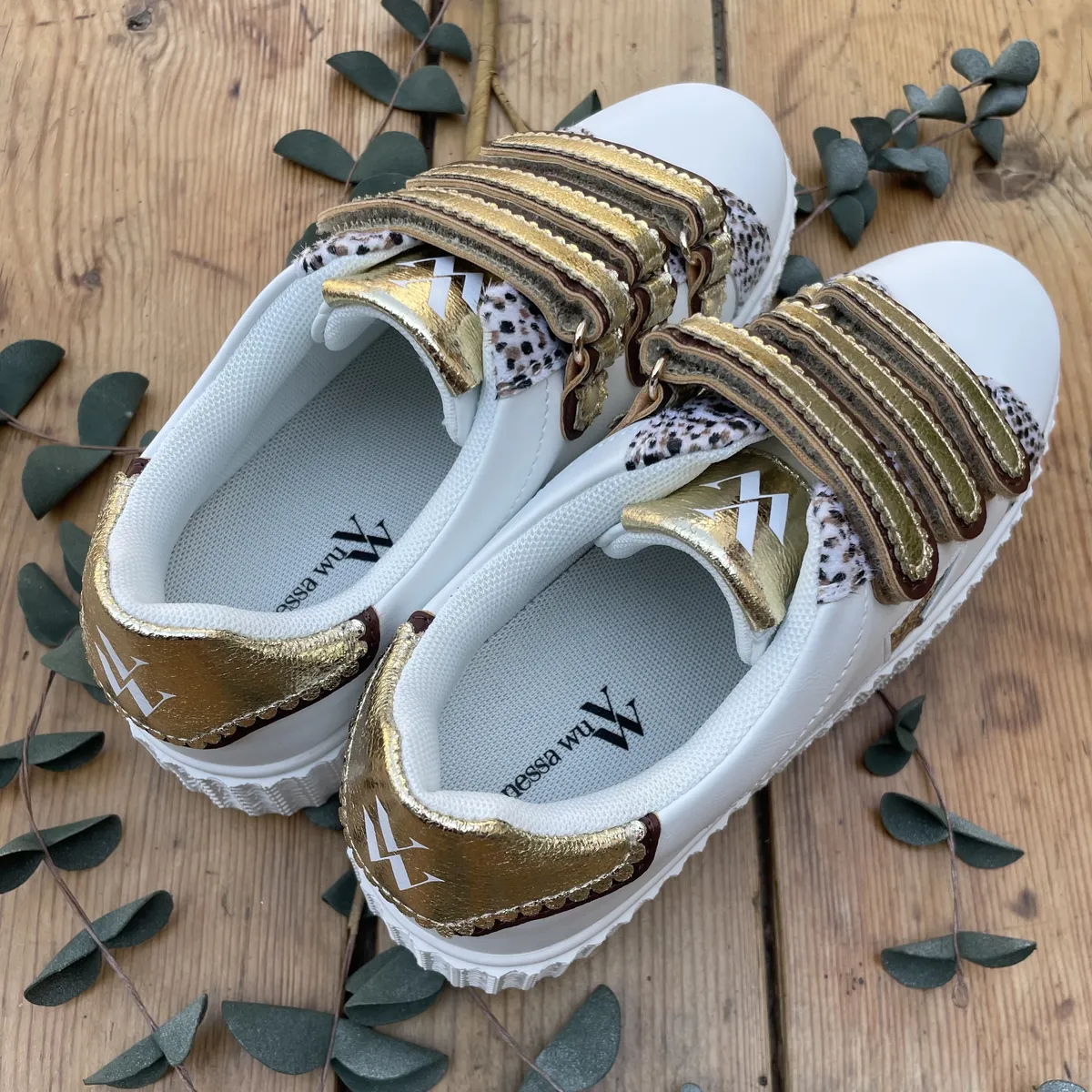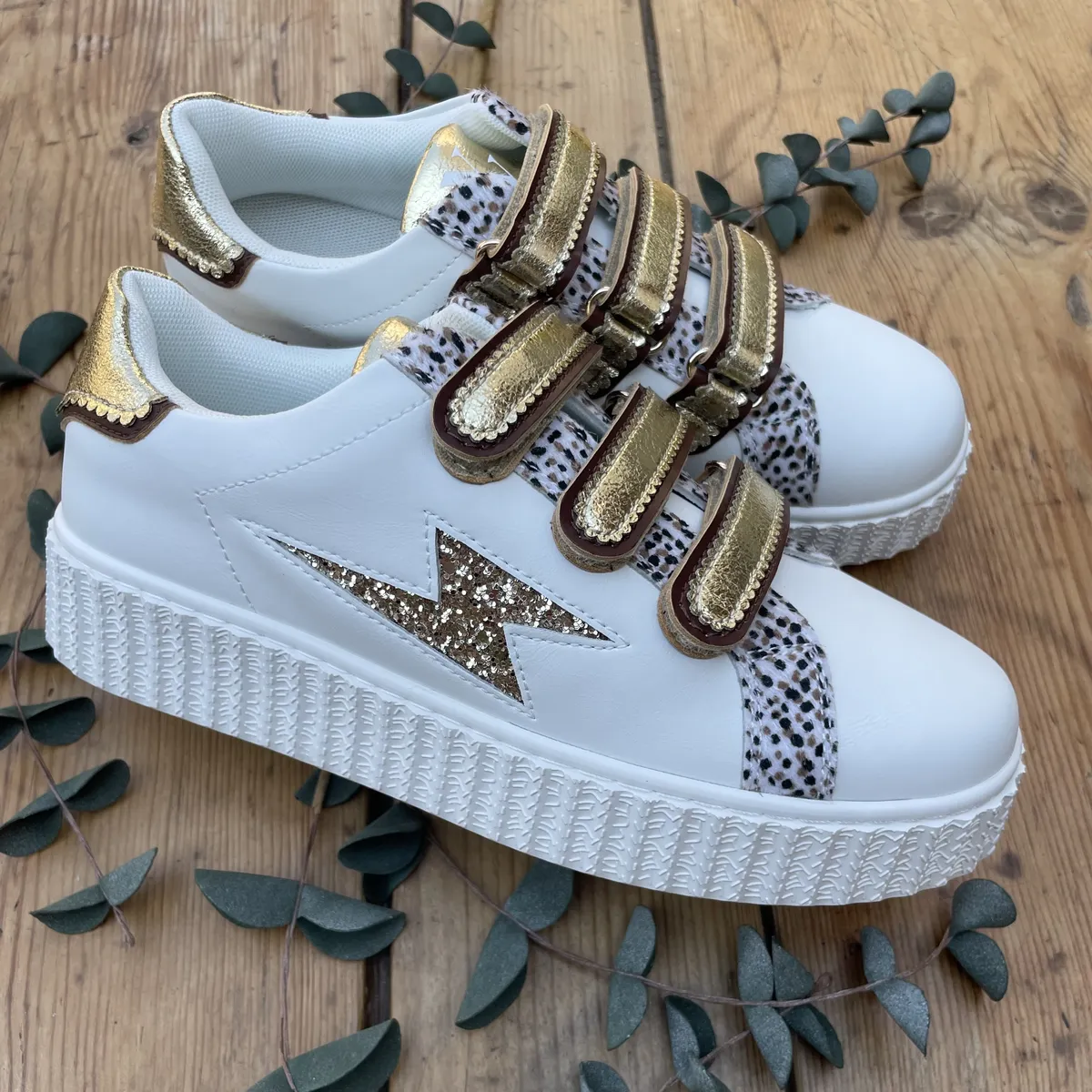 Optez pour ces baskets en similicuir blanc, alliant style et confort. Elles se distinguent par leur découpe en forme d’éclair à paillettes dorées et argentées, et leurs garants en tissu écru imprimé léopard pour une touche originale. Le patch arrière et les scratchs sont en similicuir festonné et texturé doré avec des touches marron, apportant raffinement et élégance. La semelle intérieure amovible à microbilles offre un effet massant pour un confort optimal.