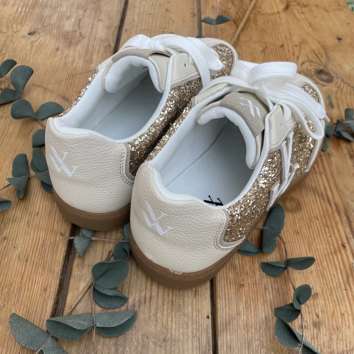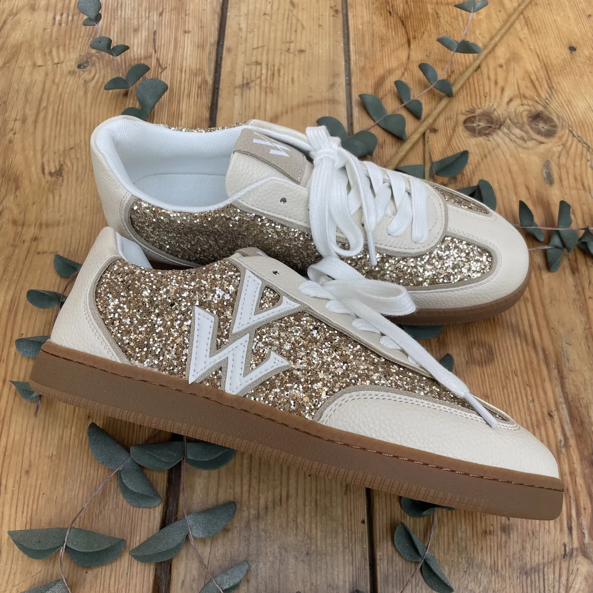 Craquez pour ces baskets à paillettes or et argent qui apportent une touche lumineuse et tendance à vos tenues. Le monogramme en similicuir blanc s’associe élégamment au bout avant, à la languette, au garant et au contrefort en similicuir effet grainé beige clair. Des liserés en suédine effet daim fendu beige gris viennent souligner des lignes de la chaussure avec subtilité. Pratiques et confortables, elles se ferment par des lacets blancs et disposent d’une semelle intérieur amovibles.
