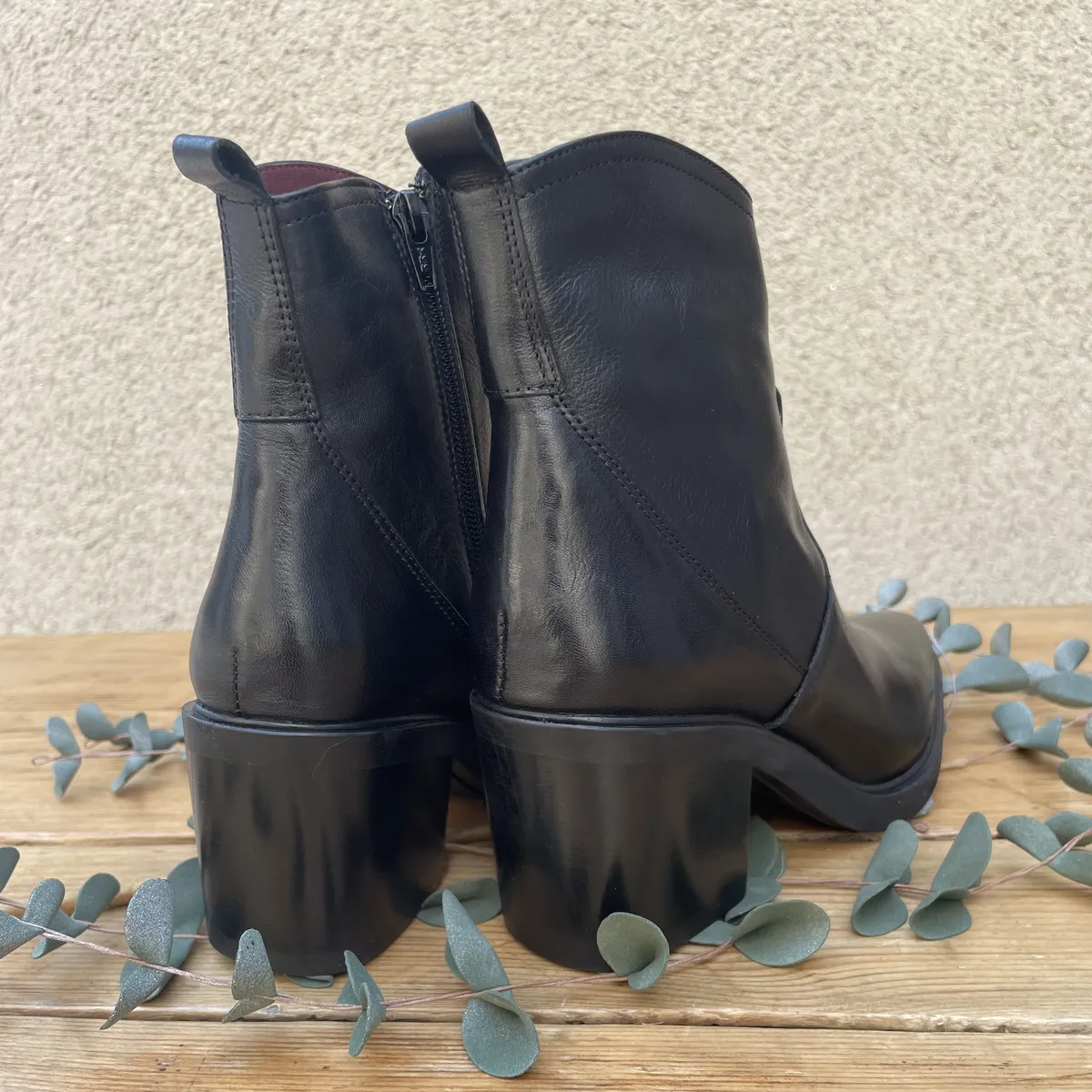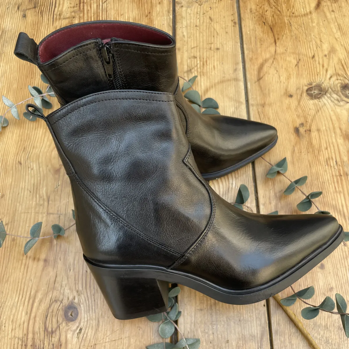 Cette bottine noire en cuir allie sophistication et modernité grâce à son bout légèrement pointu et son talon de 6,5cm, qui apporte élévation et maintien. Sa silhouette épurée en fait un modèle polyvalent, idéal pour sublimer vos tenues de bureau comme vos looks du week-end. Un classique chic et intemporel à avoir dans sa collection.