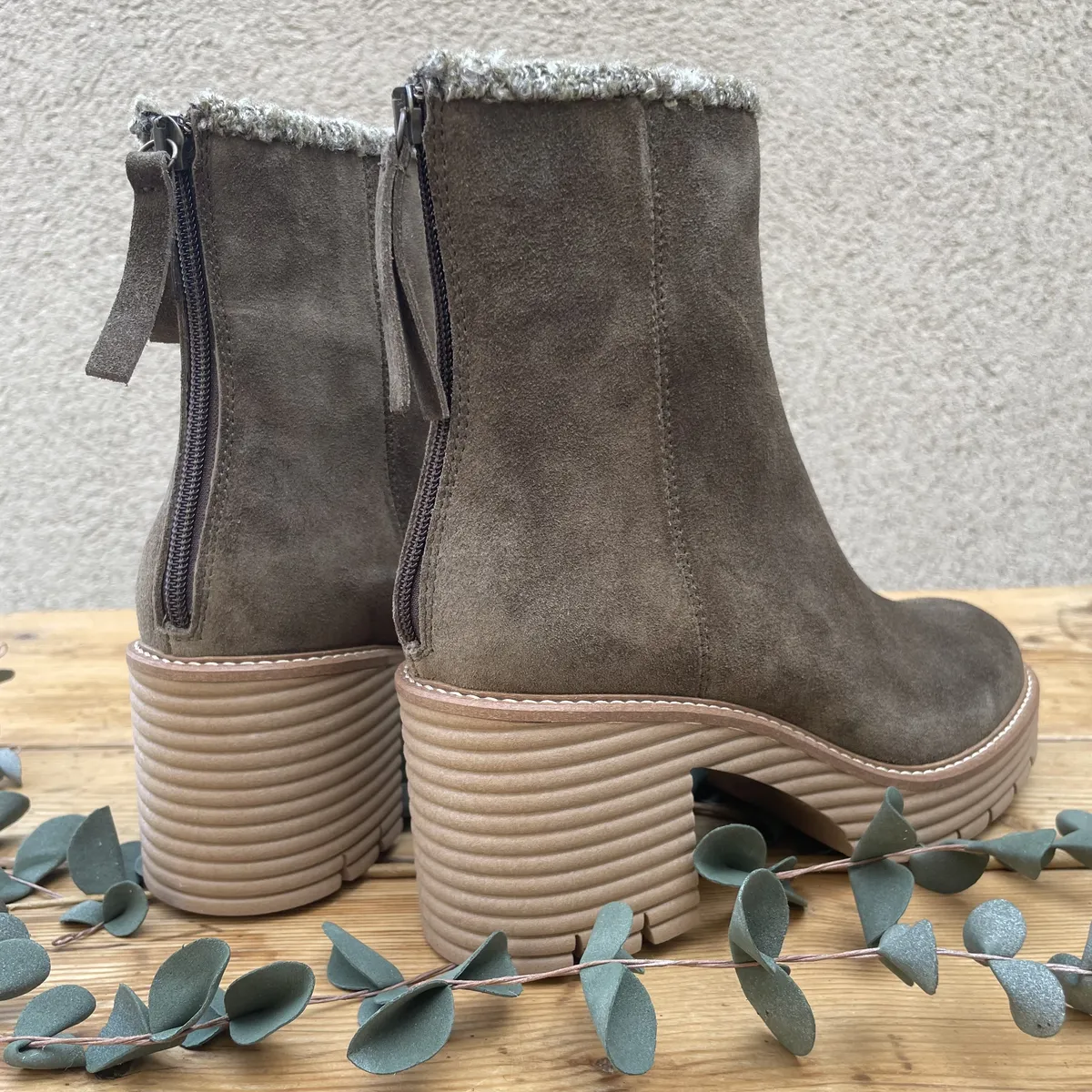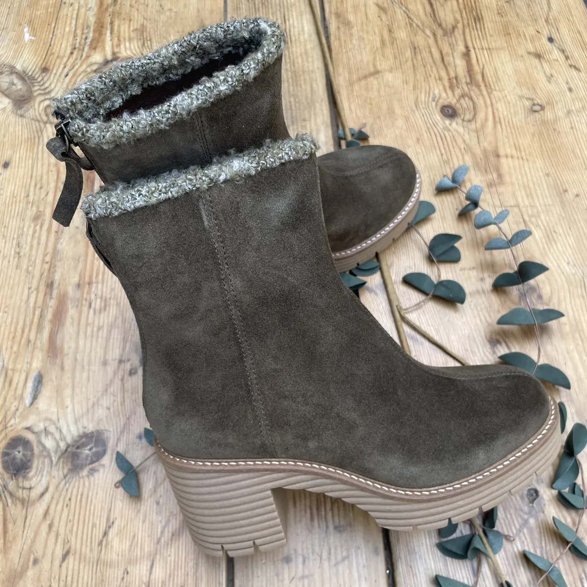Découvrez le modèle MINKA JAPPE , une bottine en nubuck kaki qui conugue style et confort. Dorée d’un talon de 7cm, elle élance la silhouette tout en restant agréable à porter au quotidient. Sa fermeture zipée à l’arrière facilite l’enfilage et apporte une touche moderne et originale à son design. La semelle en gomme assure souplesse, adhérence et confort de marche, idéale pour un usage quotidient.