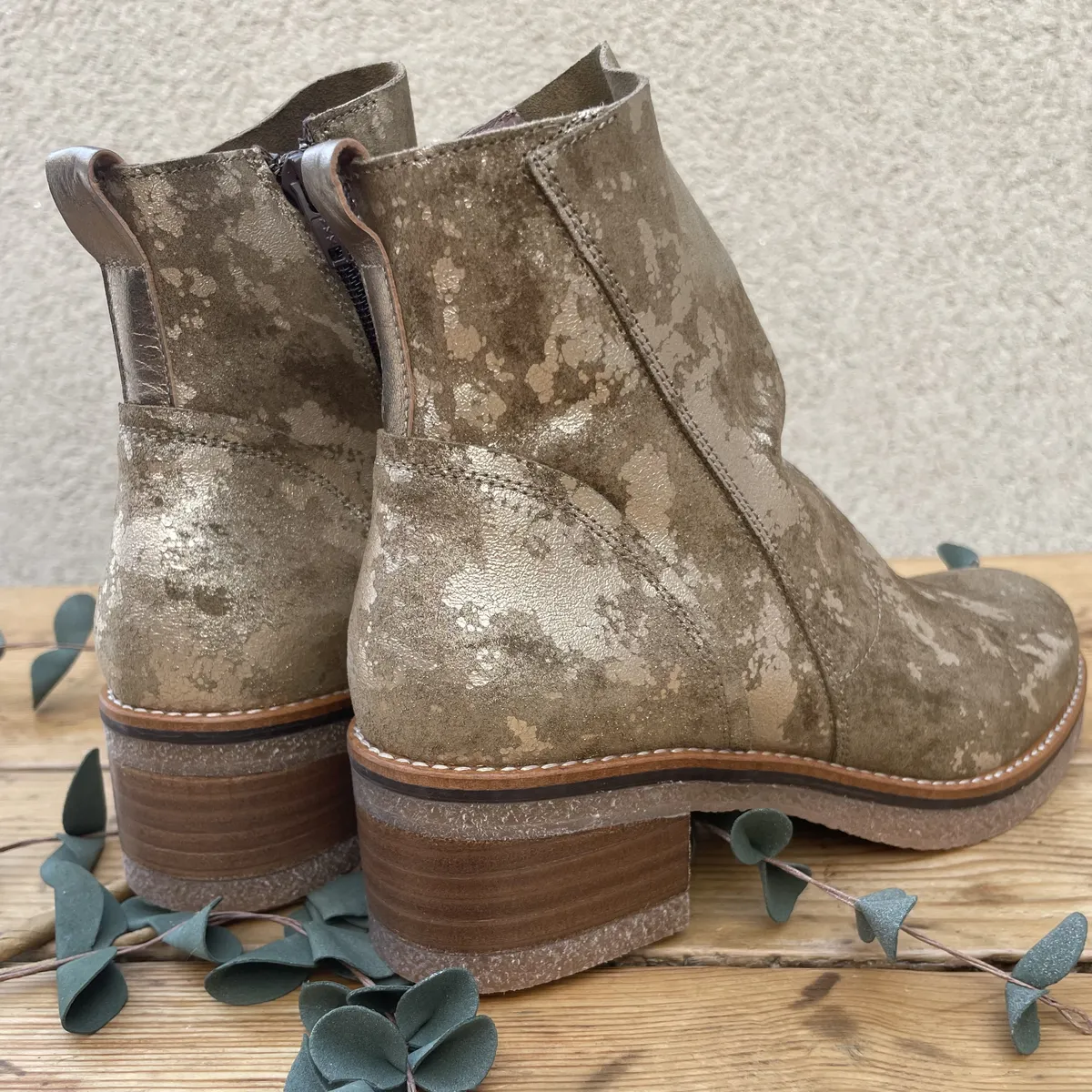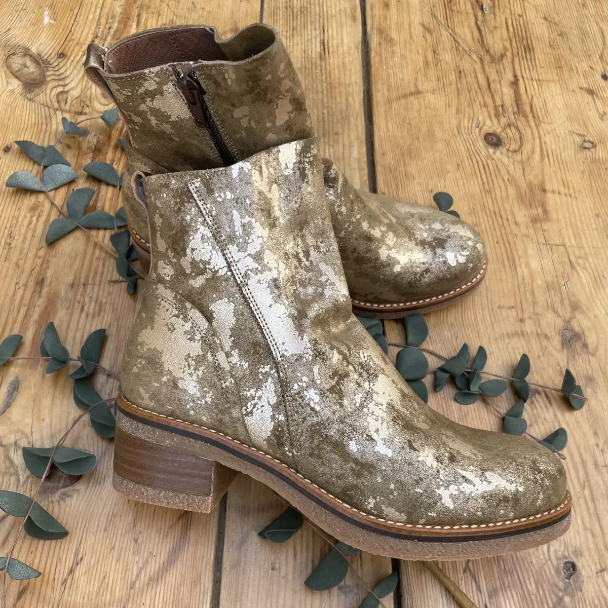 Osez la brillance subtile avec les bottines MKD CASA. Confectionnées en nubuck métallisé doré et effet vieilli, elles se distinguent par leur texture lumineuse et originale, idéale pour apporter une touche tendance à vos looks automne-hiver. Elles reposent sur un talon de 5cm qui élance la silhouette tout en restant confortable. La fermeture éclair discrète permet un enfilage rapide et pratique, tandis que la semelle souple et resistante assure stabilité au quotidien.
