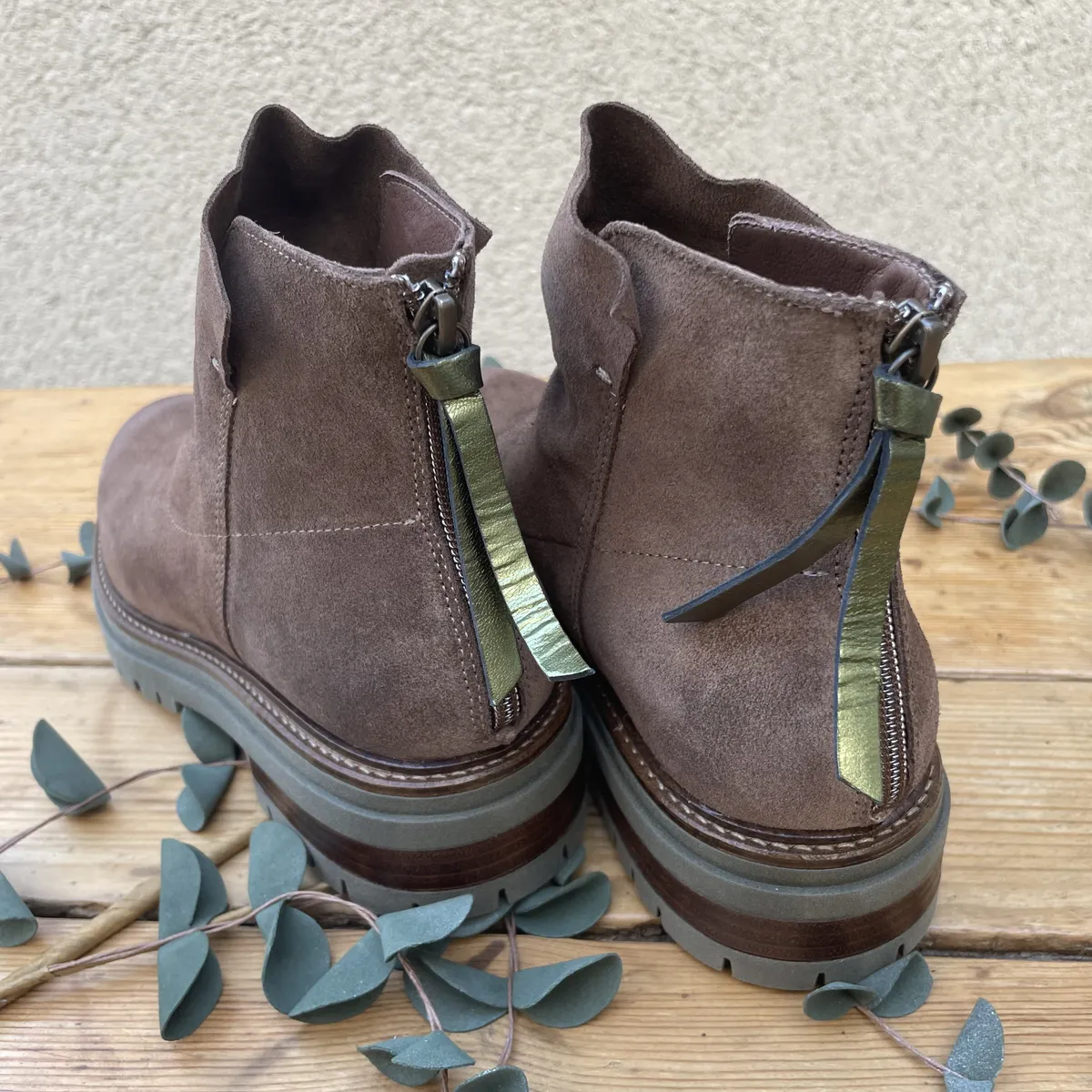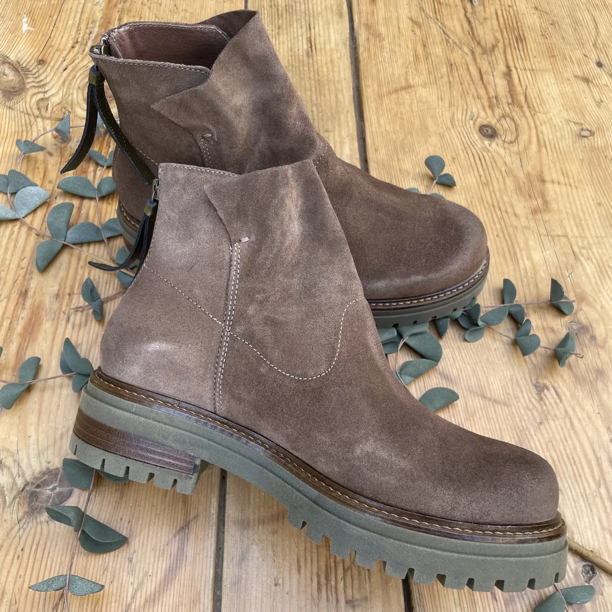 Découvrez les bottines MKD HAMILO, un modèle qui conjugue style moderne et praticité. Confectionnées en nubuck chocolat, elles se distinguent par leur semelle crantée kaki qui apporte du caractère tout en garantissant confort et stabilité. Avec leur talon de 4cm, elles offrent une légère hauteur agréable pour un usage quotidient. La fermeture éclair à l’arrière rend l’enfilage rapide et facile, tout en donnant une touche contemporaine à leur design.
