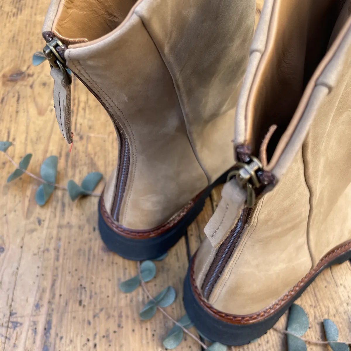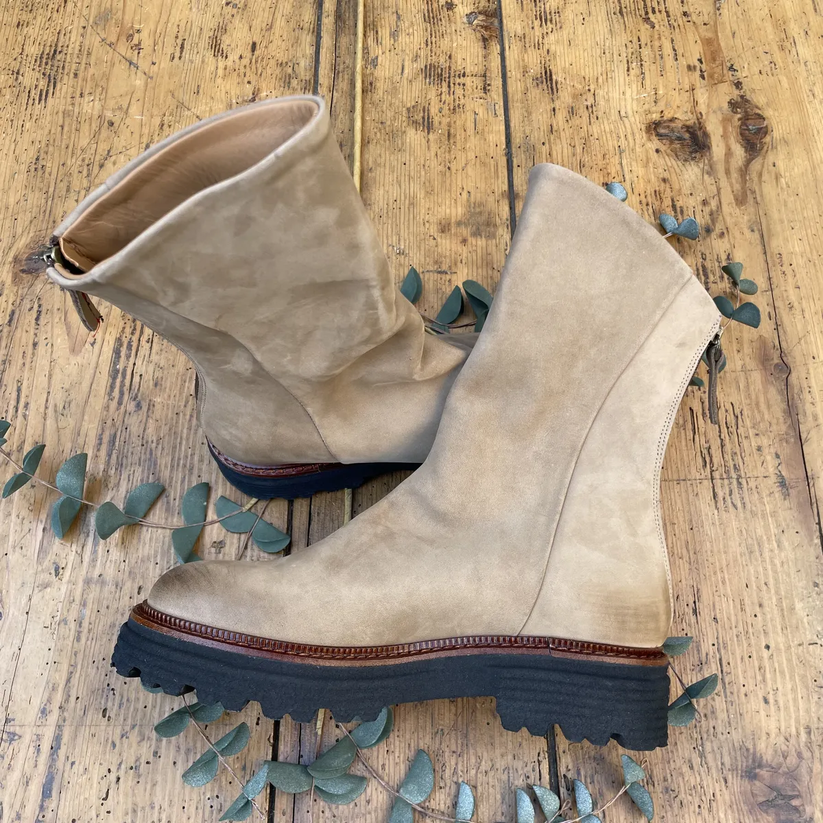 Apportez une touche moderne et décontractée à vos tenues avec ces bottines beige légèrement hautes. Leur semelle noire crantéee assure confort et adhérence, tandis que la fermeture éclair à l’arrière facilite l’enfilage. L’effet froissé apporte un détail subtil et tendance, donnant du caractère au modèle.
