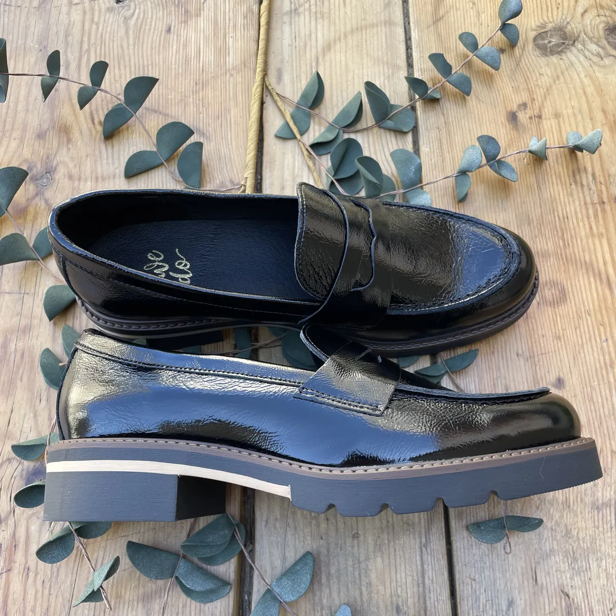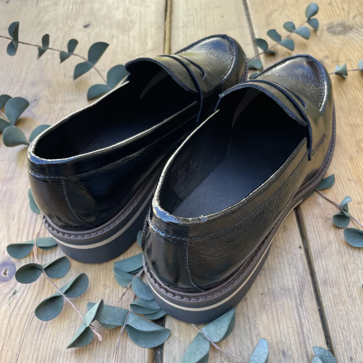 Ce mocassin WEDO revisite le classique avec une touche contemporaine. Réalisé en cuir noir vernis, il séduit par son éclat élégant et sa semelle crantée qui lui apporte caractère et confort. Le talon de 3cm offre une légère hauteur hauteur idéale pour un usage quotidien. Ses détails contrastés ajoutent une note raffiné et originale. Un modèle polyvalent, parfait pour un look citadin chic ou décontracté.